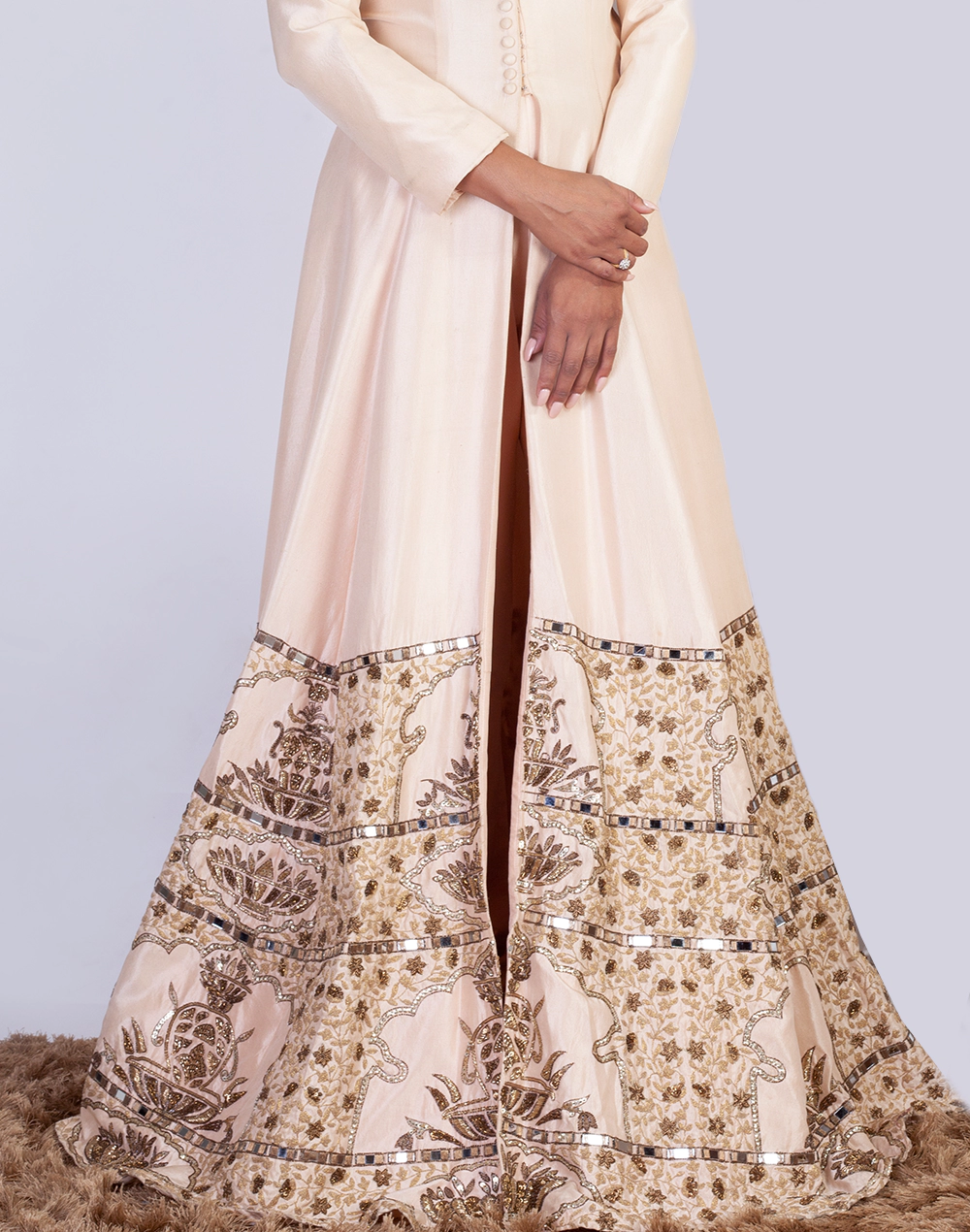 This exquisite and elegant Anarkali set in ivory is a beautiful blend of traditional style and modern sensibilities. The intricate embroidery work and luxurious fabric make it a perfect choice for formal occasions