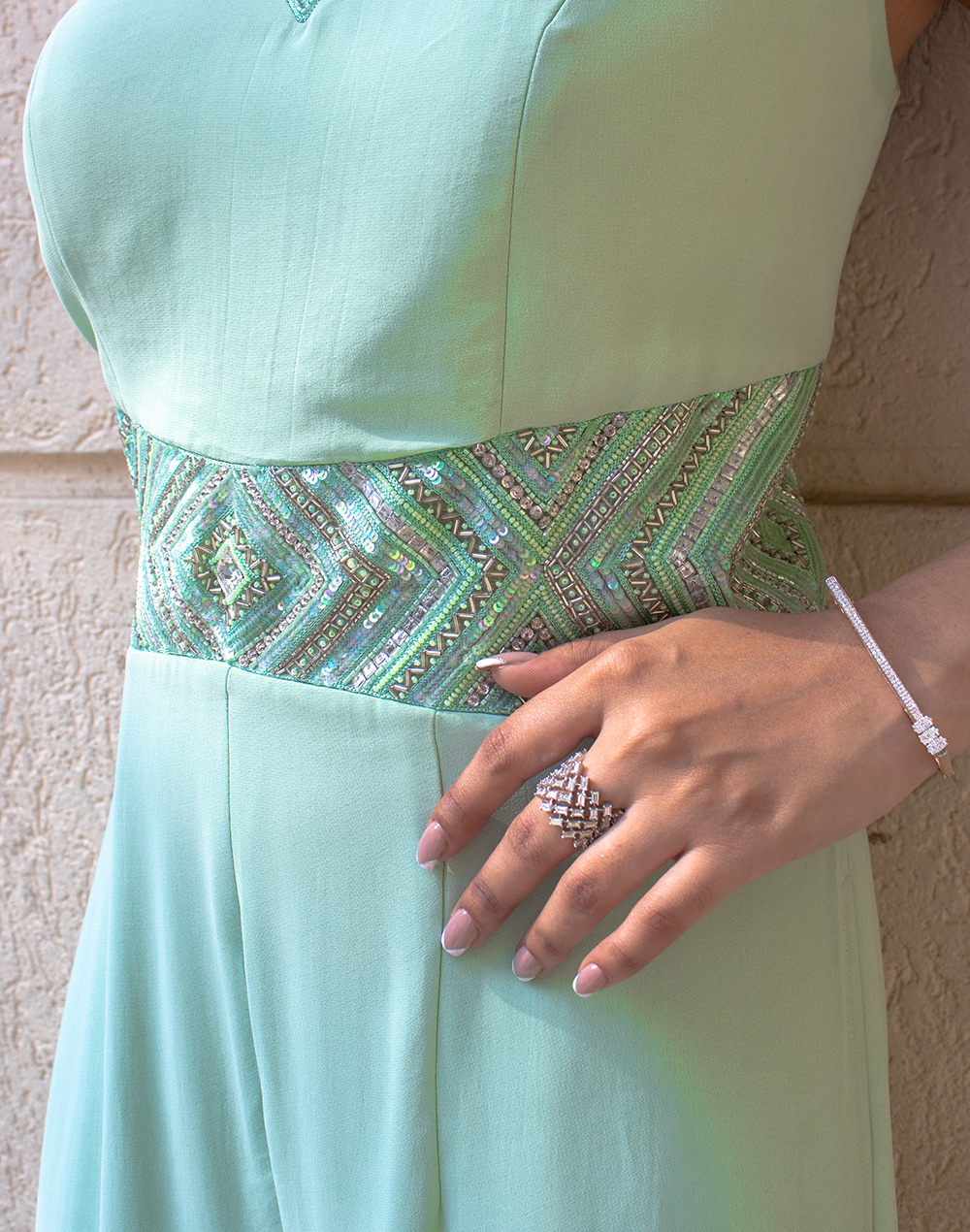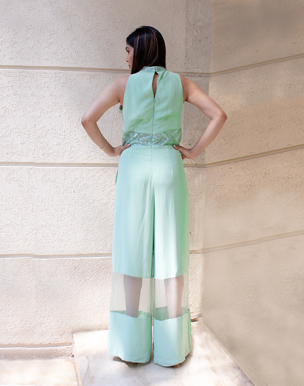 A pastel green Jumpsuit with stunning embroidery on the neckline and waist.